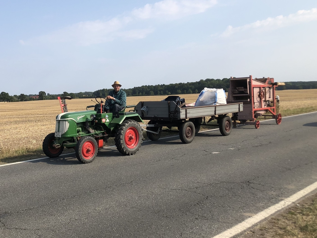 Als Vorbereitung für unser Treffen in Krokau am 25. und 26. August waren einige Mitglieder schon fleißig. Mit einem Selbstbinder der Marke JF wurden ca. 800 Garben gebunden. Gezogen wurde der Selbstbinder von einem Güldner. Das ganze Gespann können sie sich in Krokau auch ansehen, dort werden die Garben dann auch vor Ort ausgedroschen.