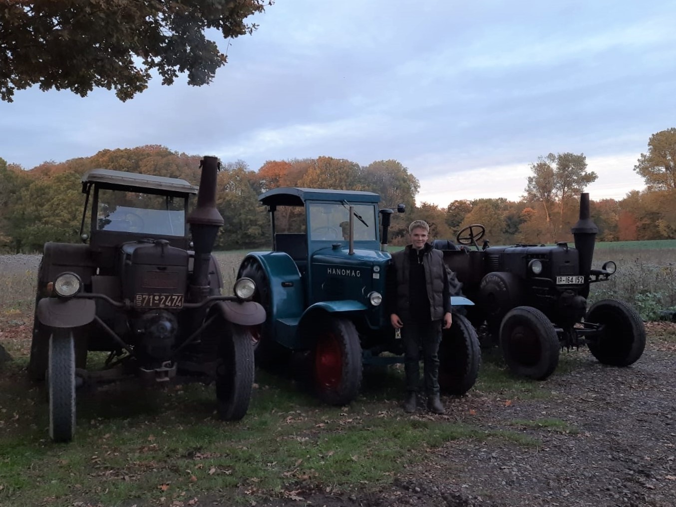 Es ging weiter auf den Hof Maaskamp der Familie Schumacher. Der Bio-Betrieb baut auf 160 ha verschiedenste Sommer- und Wintergetreide an, dazu Zwischenfrüchte wie Kleegras sowie Buchweizen und Ackerbohnen für die 400 Mastschweine. Wir haben einen interessanten Einblick in die Herausforderungen des biologischen Anbaus bekommen. Besonderes Interesse galt auch den Maschinen auf dem Hof, einem vollhydraulischen intelligenten Striegel, einem Powerstar sowie der Hacke. Fast alle Geräte wurden zusammen mit anderen Landwirten der Region angeschafft. Auf dem Betrieb laufen neben einem modernen Steyer und einem MF unter Anderem ein 55 Jahre alter IHC 624 und ein Schlüter Super 1250 V.