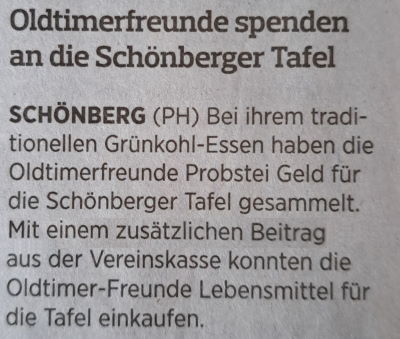 Bei unserem Grünkohl Essen am 10.12.2022 haben wir, die Oldtimerfreunde Probstei e.V., für die Schönberger Tafel gesammelt. Dort versorgen 20 Ehrenamtliche mittlerweile rund 400 Personen aus der Region, und dies möchten wir unterstützen. Mit den gesammelten Spenden und einem Zuschuss aus der Vereinskasse kam ein stattlicher Betrag zusammen.