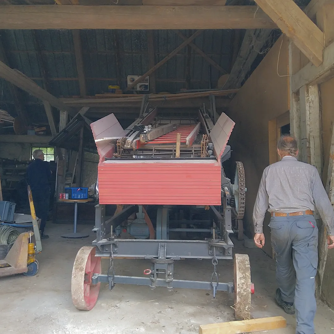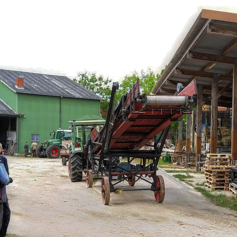Unser Höhenförderer von 1929 (Firma Claussen aus Kappeln) muss wegen seiner Größe immer raus wenn wir irgendwo ran wollen. Mit fast 20 Mann waren Ballenwerfer, Sägen, Spalter, Verkehrschilder, Milchkannen, Infowände, Elektromotoren und Riemenscheiben schnell verladen und der Höhenförderer konnte zurück in die Scheune. Der Steinbrecher und Ballenwerfer werden den nächsten Monat über vom Team Schrevendorf geschmiert und neu eingestellt, Dächer und Deutzmotor der Jugendruppe werden in Probsteierhagen repariert, die Bremse befindet sich in Felm zur Durchsicht und ein weiterer Hänger randvoll mit Kleinmaterial und Infoschildern ist nach Gödersdorf gegangen.