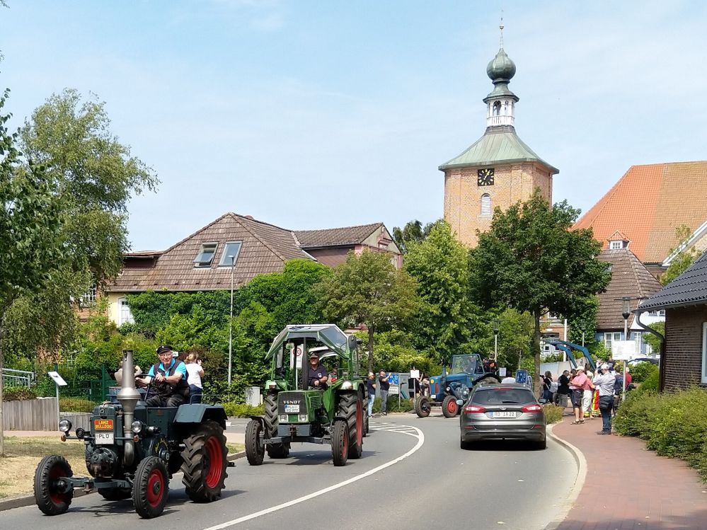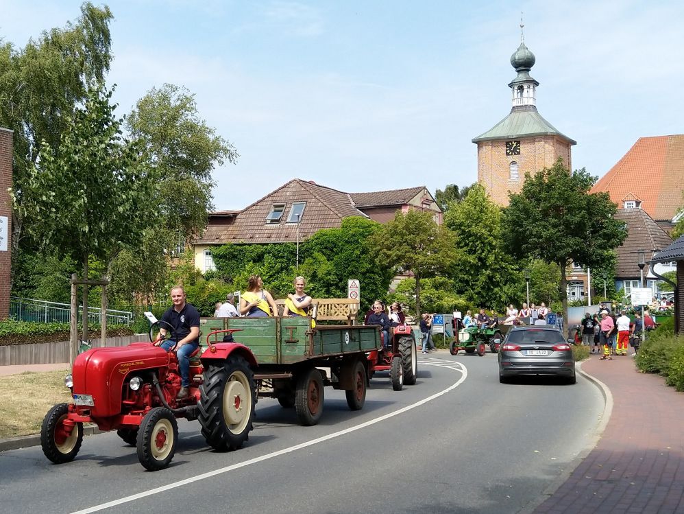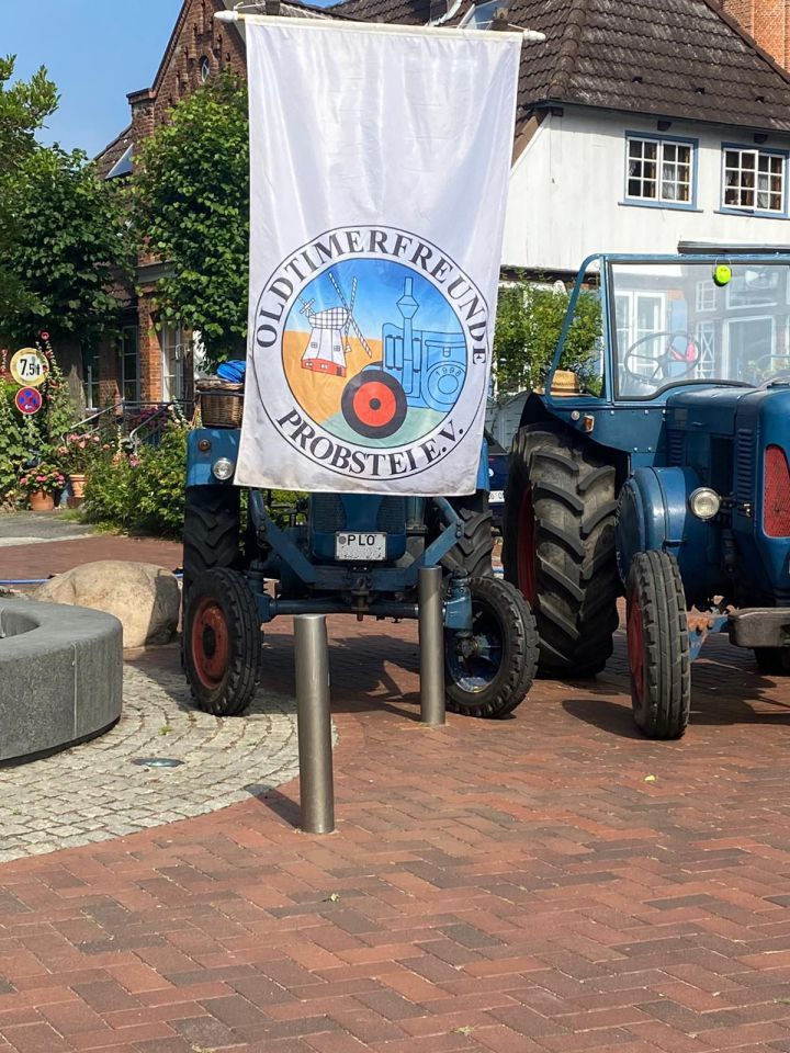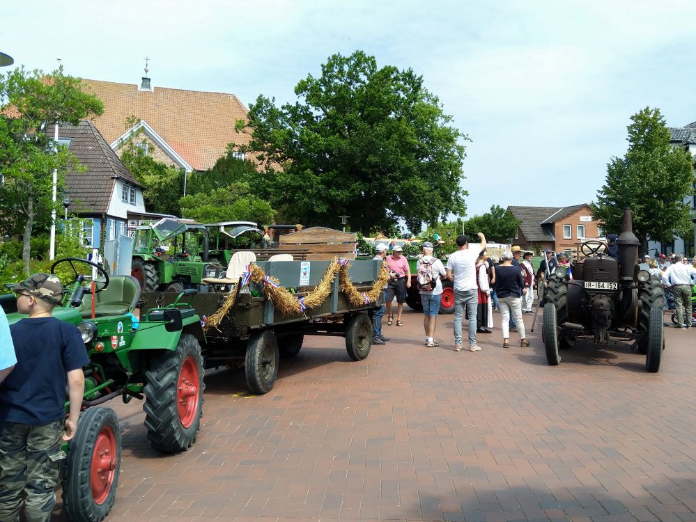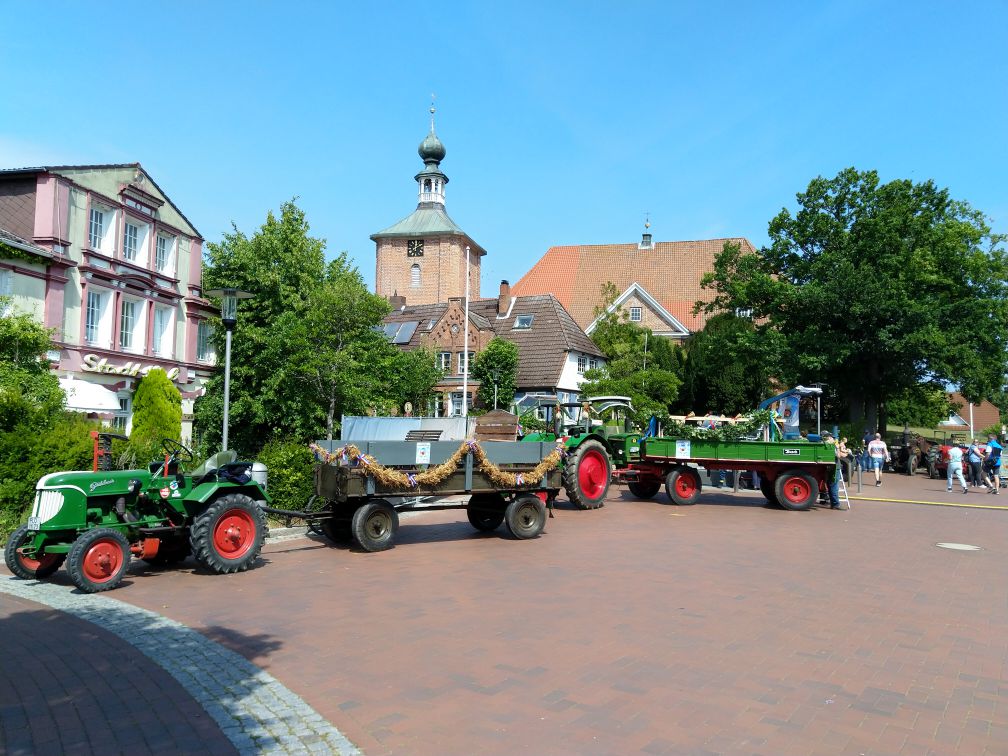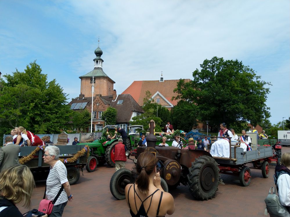 Mit elf historischen Traktoren und fünf zeitgenössischen Anhängern haben wir auf dem Schönberger Marktplatz die Besucher begrüßt. Gegen 12:00 wurden die Korntage offiziell eröffnet, die alte Kornkönigin Kaija Maus übergab ihr Amt an die neue Kornkönigin Henriette Nebendahl und die neue Kornprinzessin Jane Bruhn.