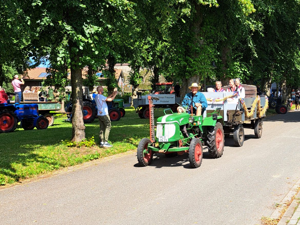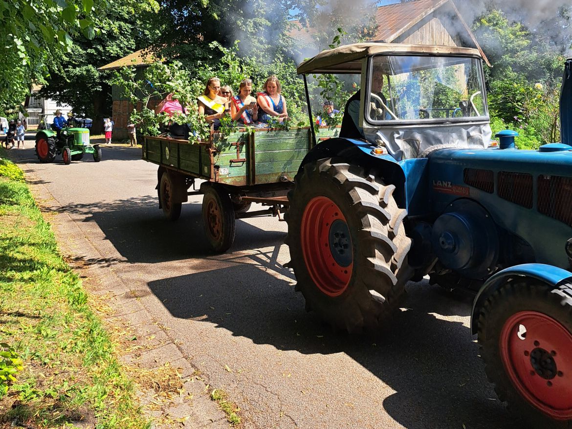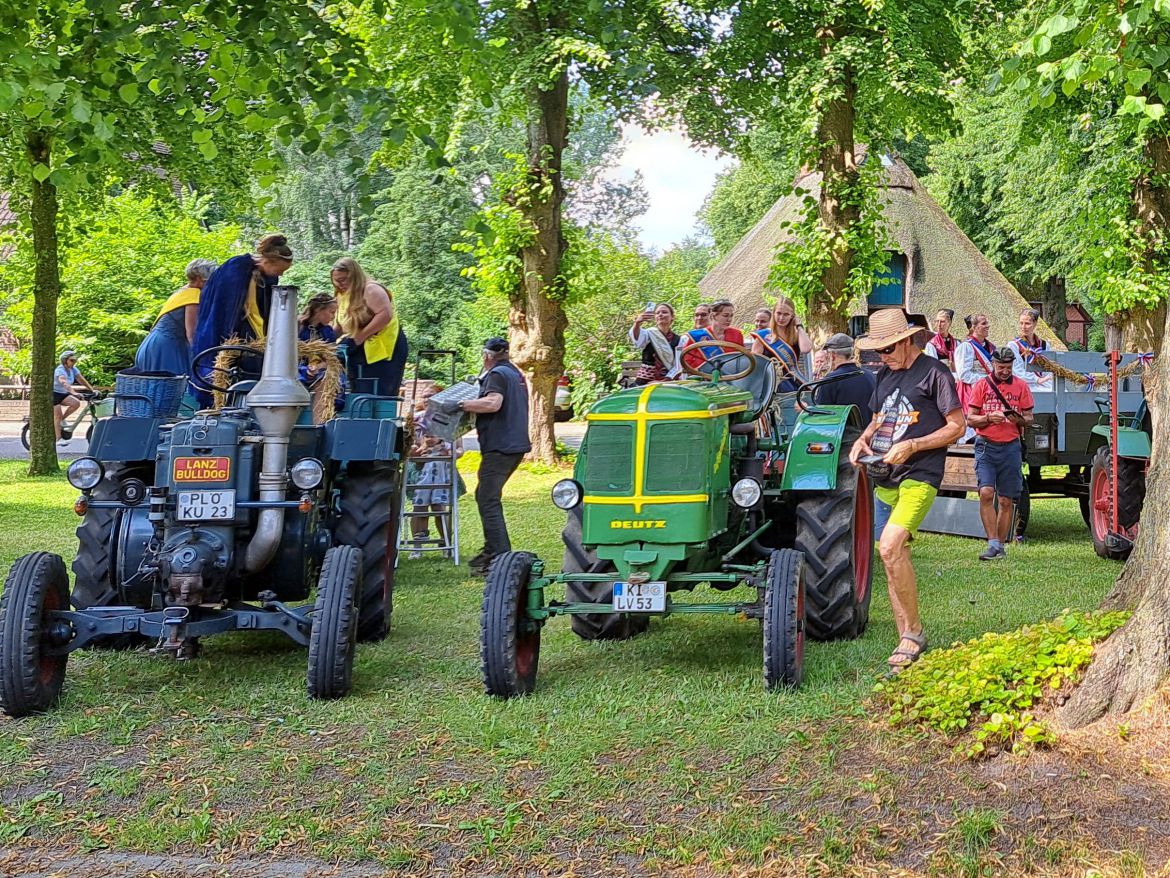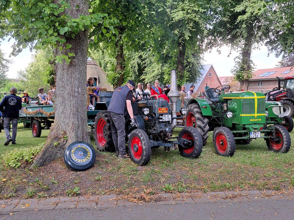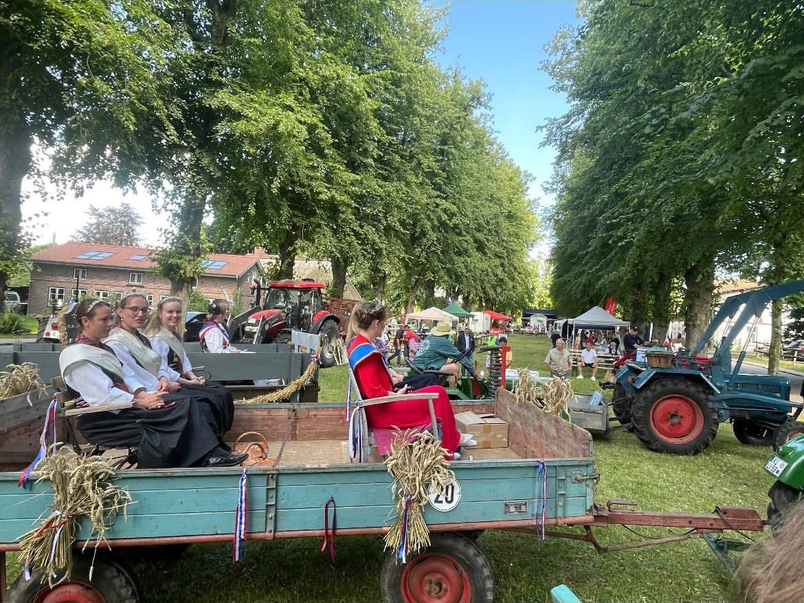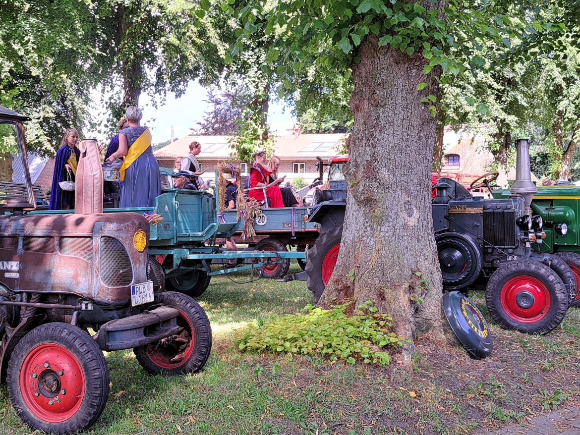 Am 27. Juli 2024 wurden die Korntage in Barsbek eröffnet. Wir waren mit 11 alten Treckern dabei. Wie in den letzten Jahren durften wir wieder die alte Kornkönigin Jane, die neue Kornkönigin Anna, die Prinzessin Henrike und weitere Produkthoheiten mit unseren Gespannen durch die wunderschöne Probstei fahren. Darunter waren: Erntemajestätinnen Vier- und Marschlande, Rapsblütenkönigshaus Fehmarn, Gettorfer Rapsblütenkönigin, Lamm-Majestäten Nordfriesland und Pellkartoffelhoheiten Hohenlockstedt. Die Damen wurden rechtzeitig zu den Feierlichkeiten auf dem Dorfplatz abgesetzt. Wir konnten im Anschluss mit unseren Traktoren einen kleinen Vorgeschmack auf unsere Veranstaltung in Krokau am 17./18. August geben. Mal wieder eine schöne Eröffnung und ein würdiger Auftakt für die Korntage 2024.