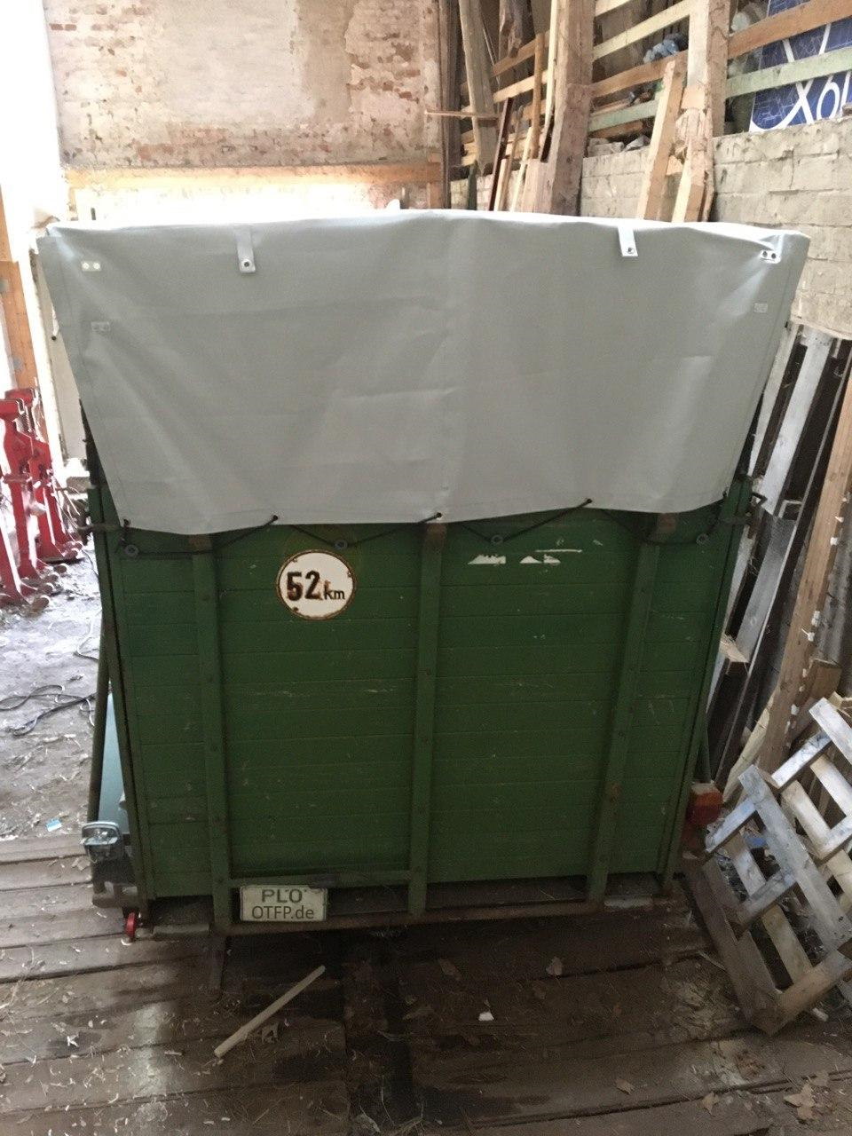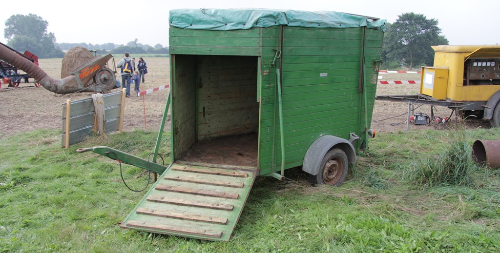 Nachdem der Hänger, ein ehemaliger Viehtransporter, einachsig, mit hinterer Ladeklappe und vorderer Ausstiegsklappe, neu bereift wurde, haben wir in Hohenfelde den alten Boden ausgebaut, ein L Profil zur Aufnahme der hinteren Klappe eingebaut (das vorhandene war total abgerostet), den Boden mit Siebdruckplatten neu belegt, die aufgenagelte Dachfolie entfernt, die vergammelten obersten Bretterreihen entfernt, dann ein leichtes Satteldachprofil und die Dachverschalung wieder aufgebaut, die obersten Brettreihen wieder ergänzt und das Dach mit einer, vom Segelmacher aus Laboe, angefertigten Dachplane belegt und die Beleuchtung erneuert.