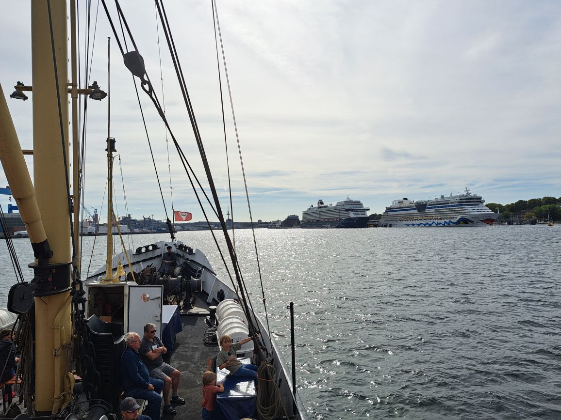 Die Bussard ist ein Tonneleger, der 1906 auf der Meyer Werft in Papenburg gebaut wurde. Das Schiff hat eine bewegte 70-jährige Dienstzeit hinter sich, wovon uns die Crew ausführlich berichtet hat. Im Anschluss lag das Schiff 25 Jahre lang trostlos im Museumshafen. 2001 fand sich eine Truppe Ehrenamtlicher und hat entgegen vieler Einschätzungen das Schiff wieder in Fahrt gebracht. Heute wird das Schiff mit ganz viel Hingabe gepflegt und im Sommer regelmäßig gefahren. Der Verein hat mit steigenden Kosten und Nachwuchssorgen zu kämpfen. Und dennoch ist das Schiff in einem beeindruckenden Zustand und ein fester Teil des Kieler Stadtbildes.