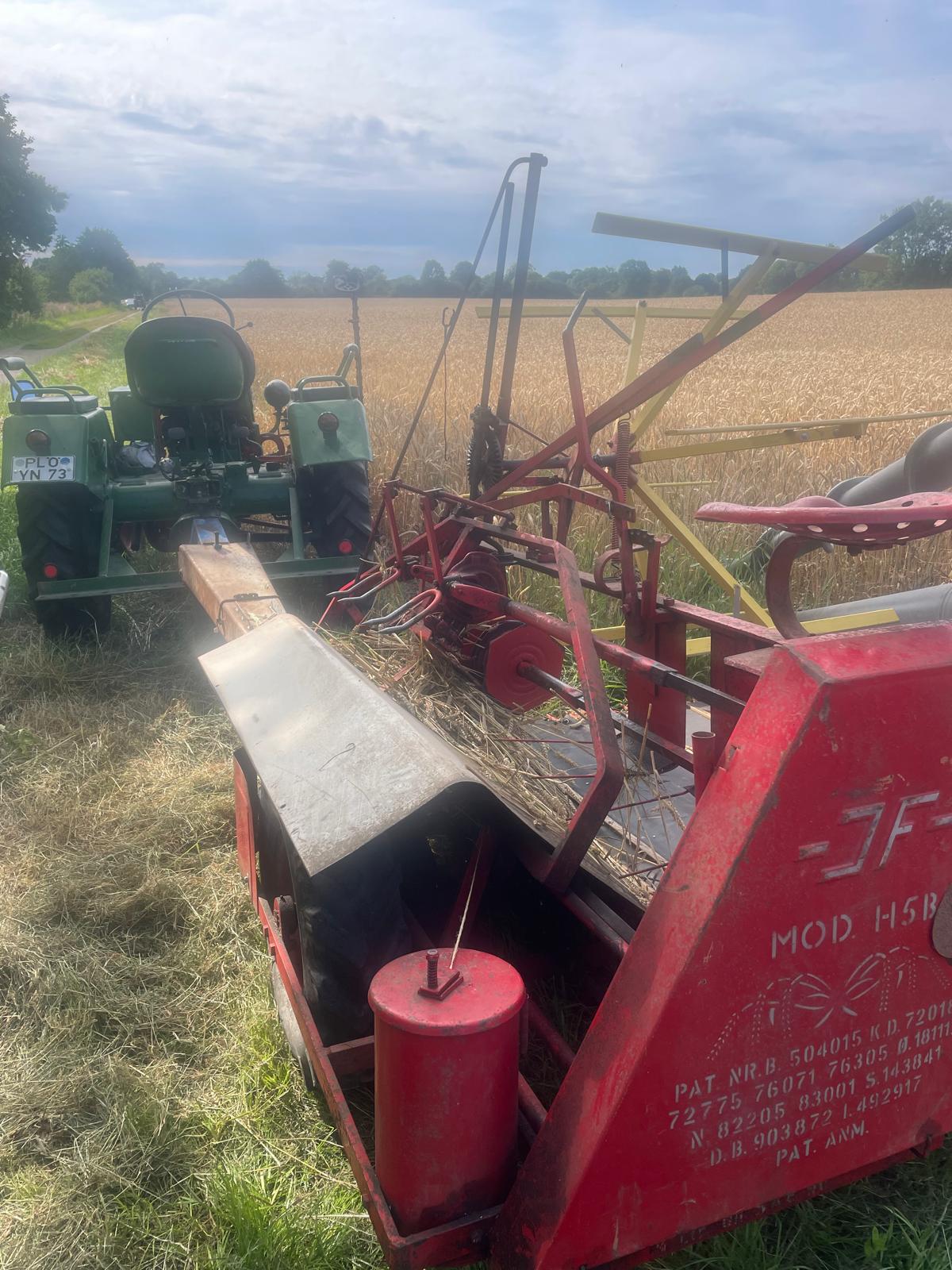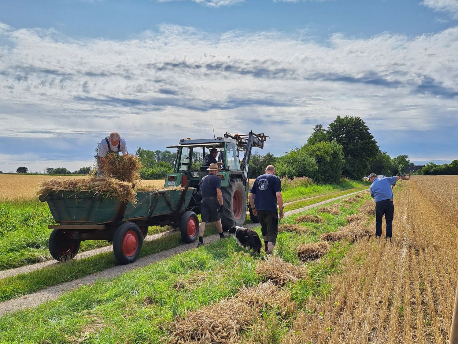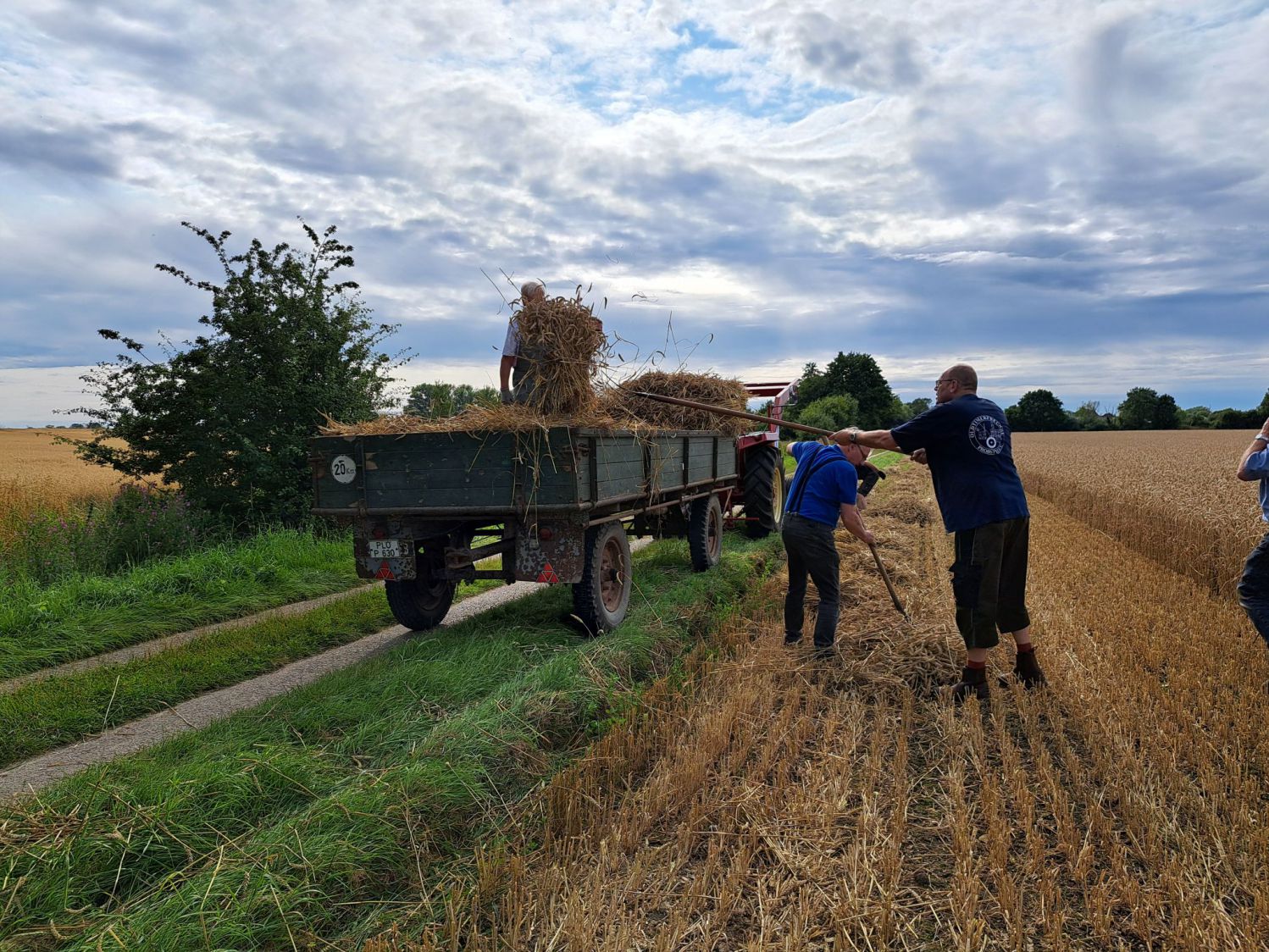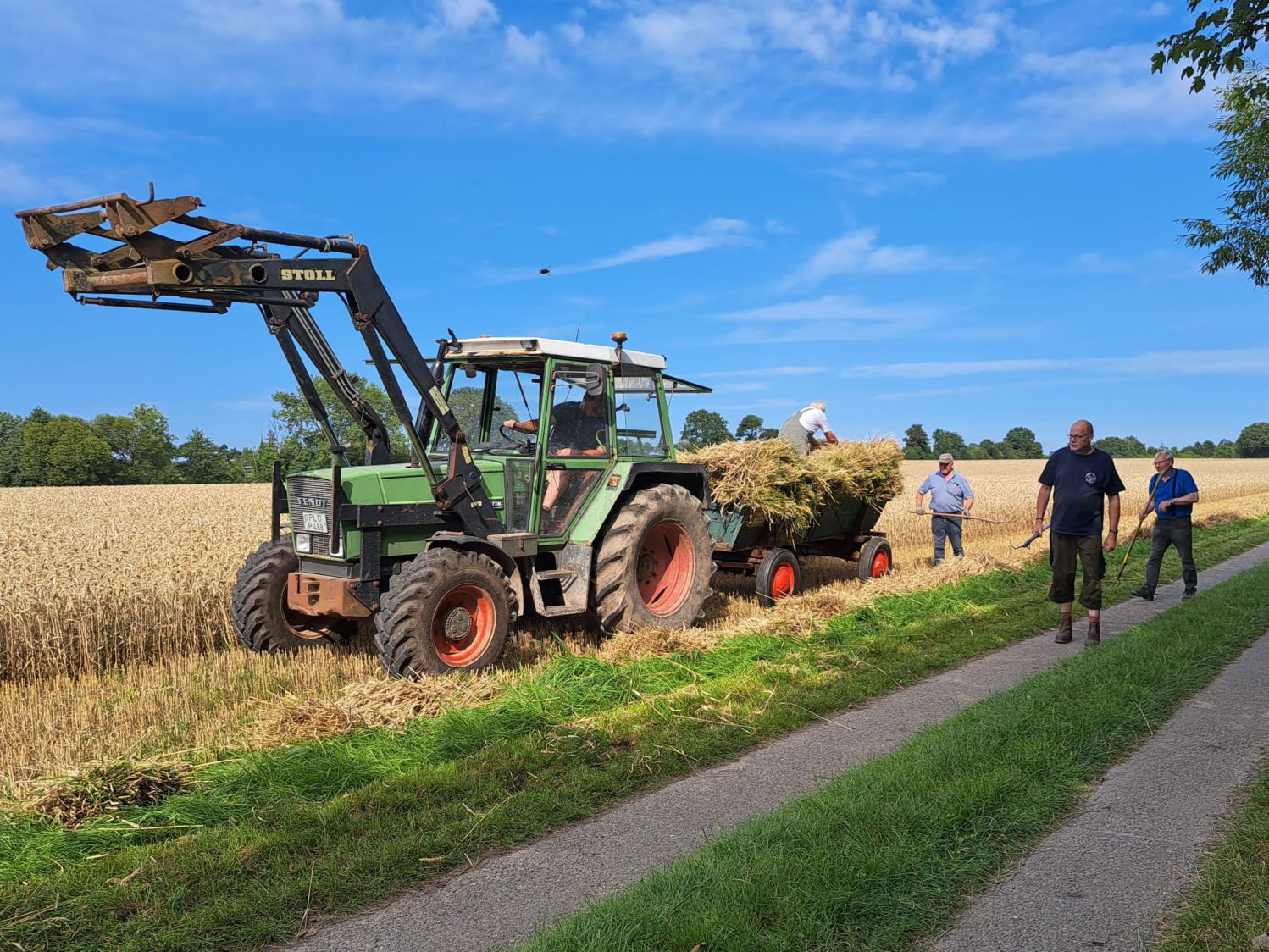 Am 25. Juli haben wir in Krokau die Gaben für unser Treffen gemäht - mit unserem JF Selbstbinder. Am nächsten Tag war Regen angesagt, es musste also eine kurzfristige Aktion werden. Detlev hatte alles vorbereitet und zehn Leute sind zum Laden dazu gekommen. Wir haben insgesamt 400 Gaben für unsere Lanz DP-8 gemäht. Dabei haben wir auch unsere neuen Leiterwagen beladen. Nach knapp zwei Stunden war alles eingefahren.