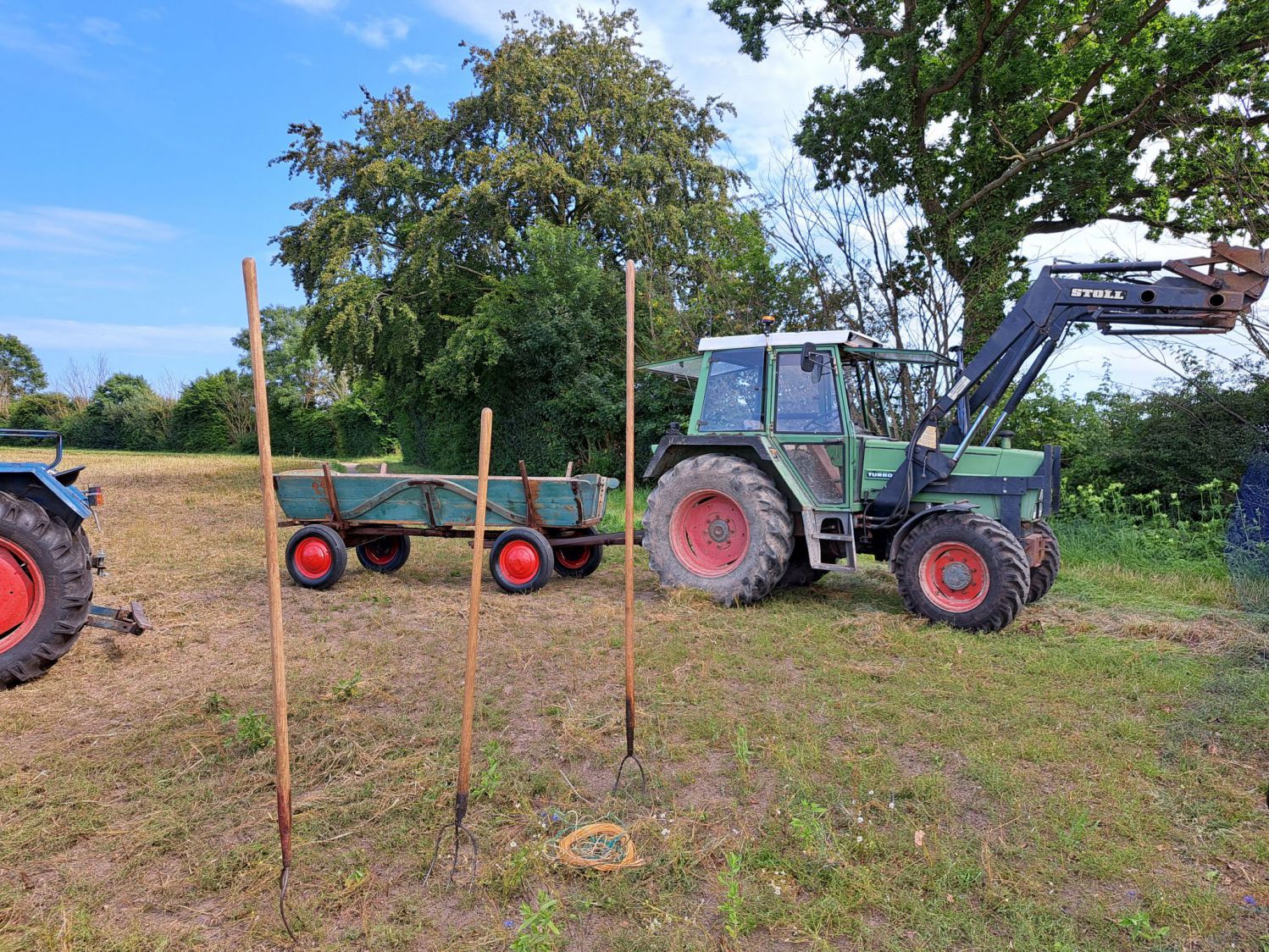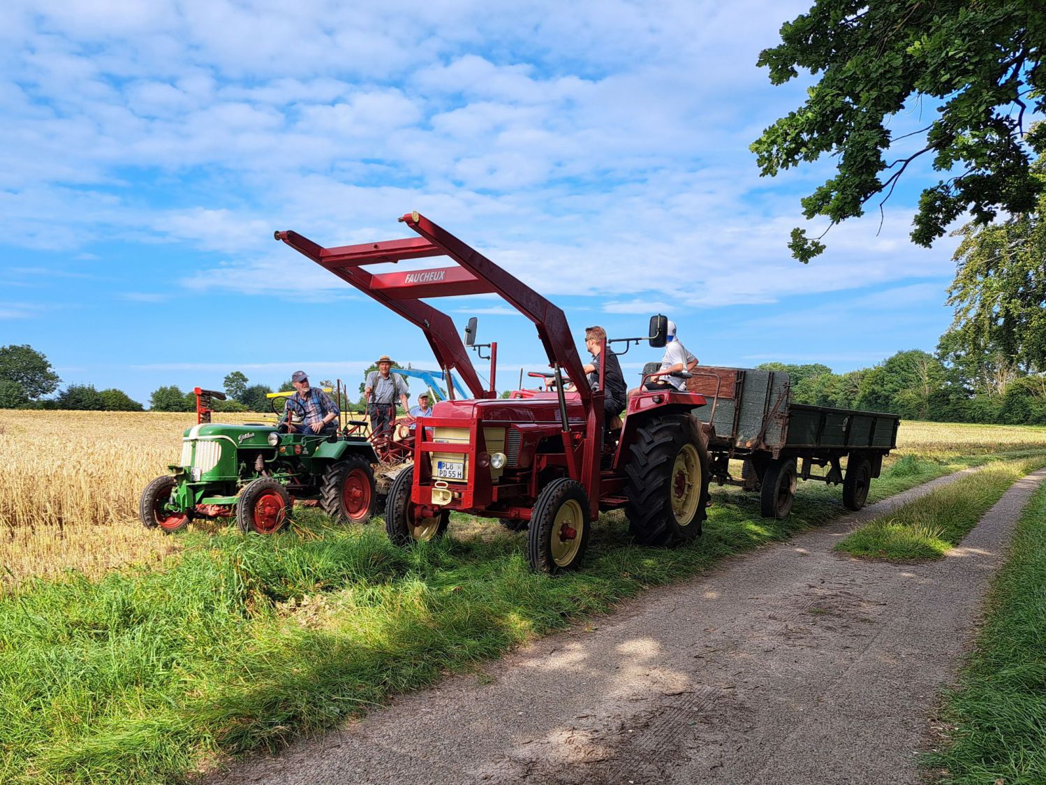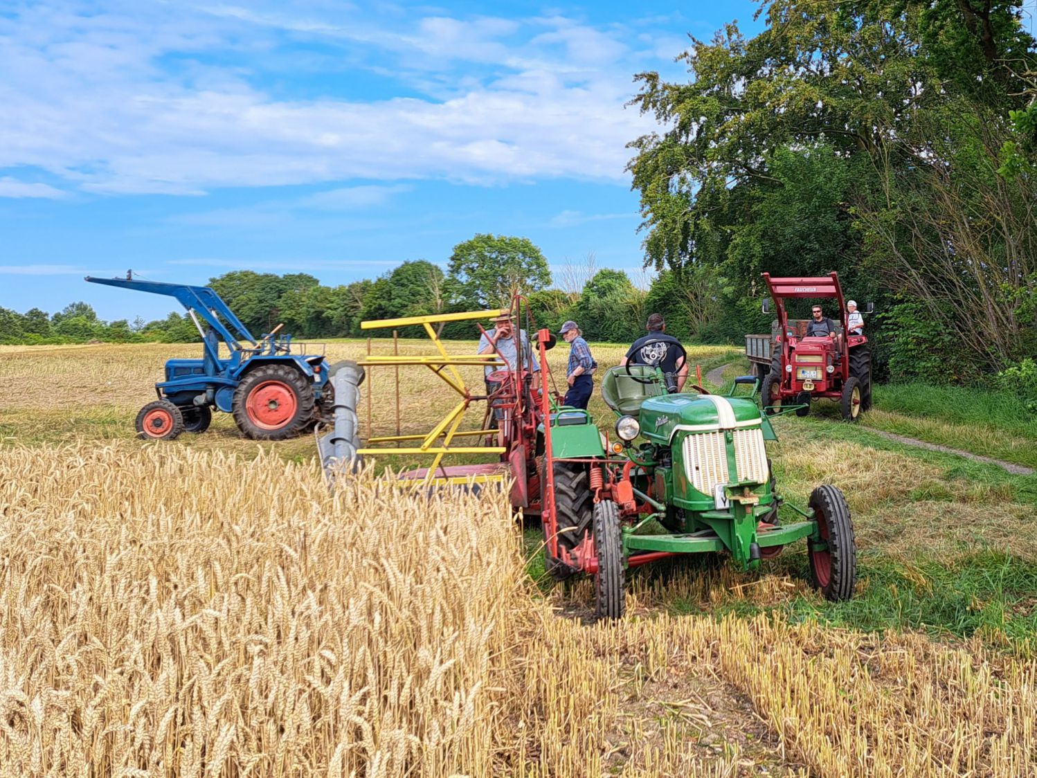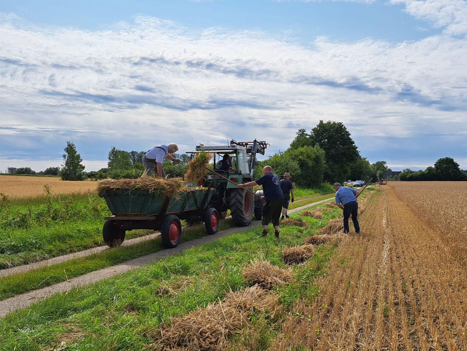 Am 25. Juli haben wir in Krokau die Gaben für unser Treffen gemäht - mit unserem JF Selbstbinder. Am nächsten Tag war Regen angesagt, es musste also eine kurzfristige Aktion werden. Detlev hatte alles vorbereitet und zehn Leute sind zum Laden dazu gekommen. Wir haben insgesamt 400 Gaben für unsere Lanz DP-8 gemäht. Dabei haben wir auch unsere neuen Leiterwagen beladen. Nach knapp zwei Stunden war alles eingefahren.
