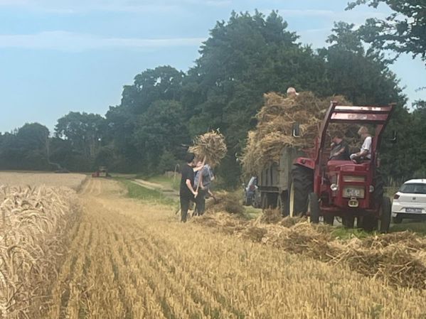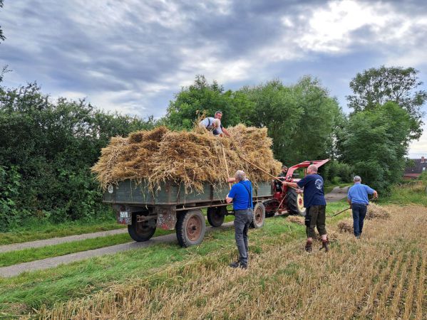 Am 25. Juli haben wir in Krokau die Gaben für unser Treffen gemäht - mit unserem JF Selbstbinder. Am nächsten Tag war Regen angesagt, es musste also eine kurzfristige Aktion werden. Detlev hatte alles vorbereitet und zehn Leute sind zum Laden dazu gekommen. Wir haben insgesamt 400 Gaben für unsere Lanz DP-8 gemäht. Dabei haben wir auch unsere neuen Leiterwagen beladen. Nach knapp zwei Stunden war alles eingefahren.
