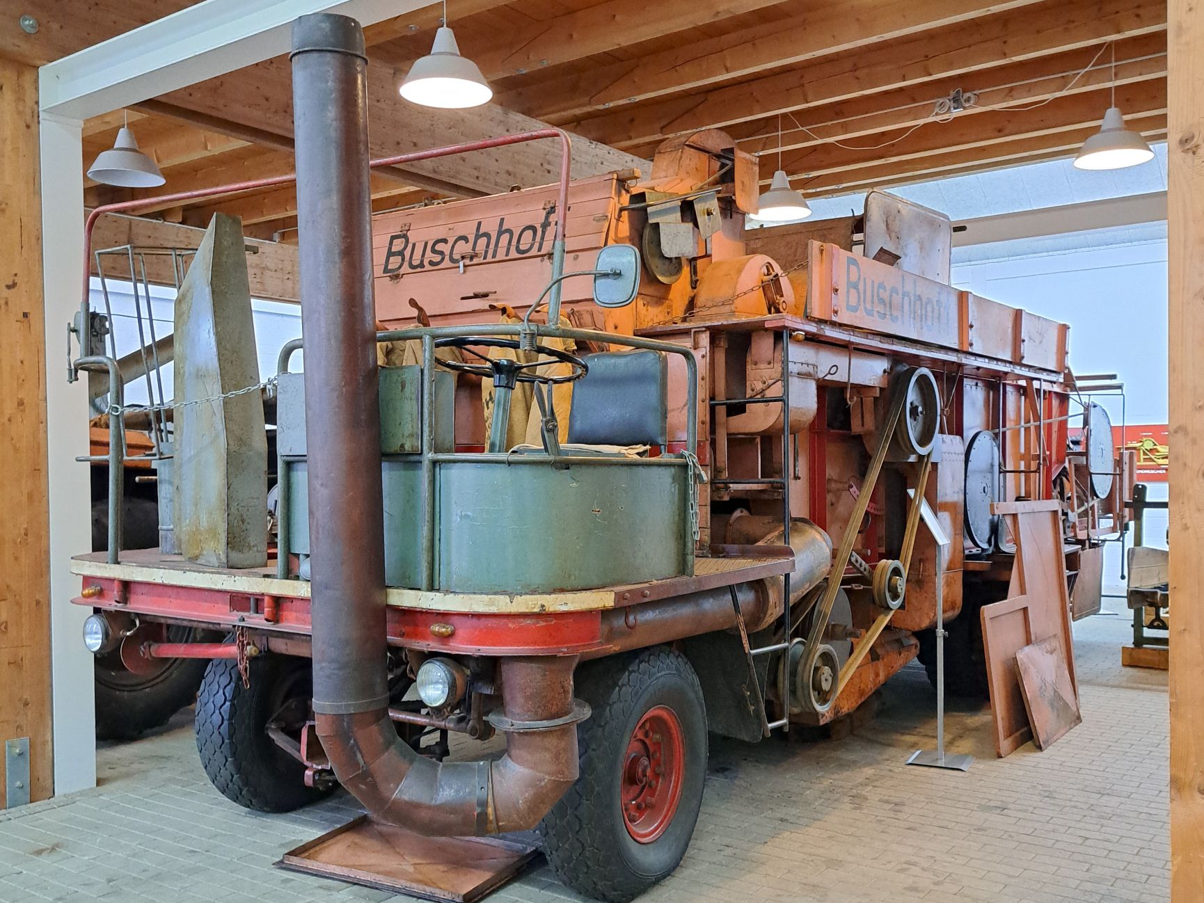 Nach einer Stärkung in Meldorf ging es dann zum Landwirtschaftsmuseum SH. Dort führte der Museumsdirektor Alexander Eggert durch das über 300 Jahre alte Dithmarscher Bauernhaus und erzählte vom Landleben um 1850. Lutz Christiansen (Werkstattleiter und Schrauber-Kollege von den Alttraktorenfreunden Westküste) zeigte die vielen alten Schätze, Traktoren und Dreschmaschinen der Landmaschinenausstellung. Neben den technischen Hintergründen standen auch die Geschichten hinter den Schleppern im Mittelpunkt. So wurde der Neuzugang, ein 1949 in Lübeck gebauter Deuliewag D24, für den Anbau von Schattenmorellen auf Obstgut Semirais niedriger konstruiert. Also mit gedrehter Vorderachse, kleineren Reifen und schnellem Getriebe. Aktuell schrauben die Alttraktorenfreunde unter anderem an einer selbstfahrenden Buschhoff-Dreschmaschine (1946), von der nur noch drei Exemplare bekannt sind.
