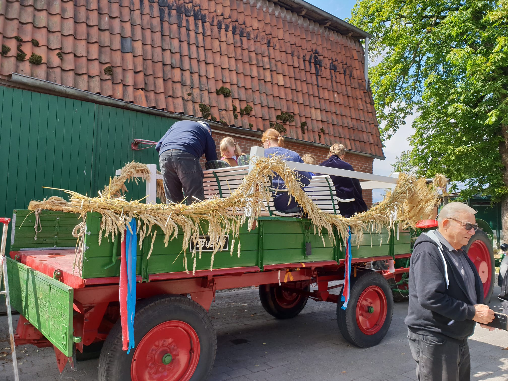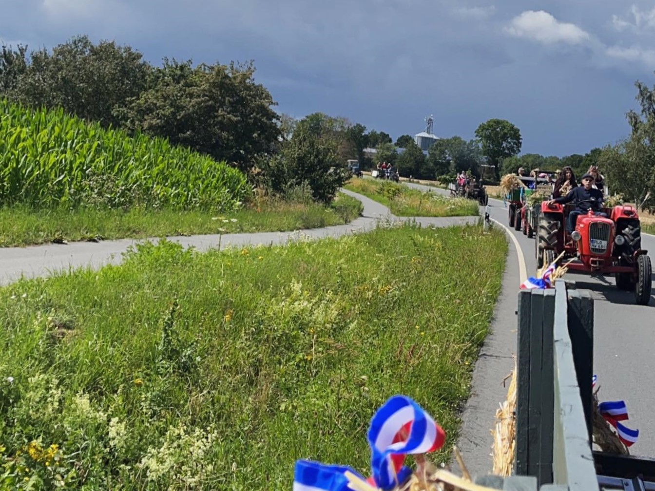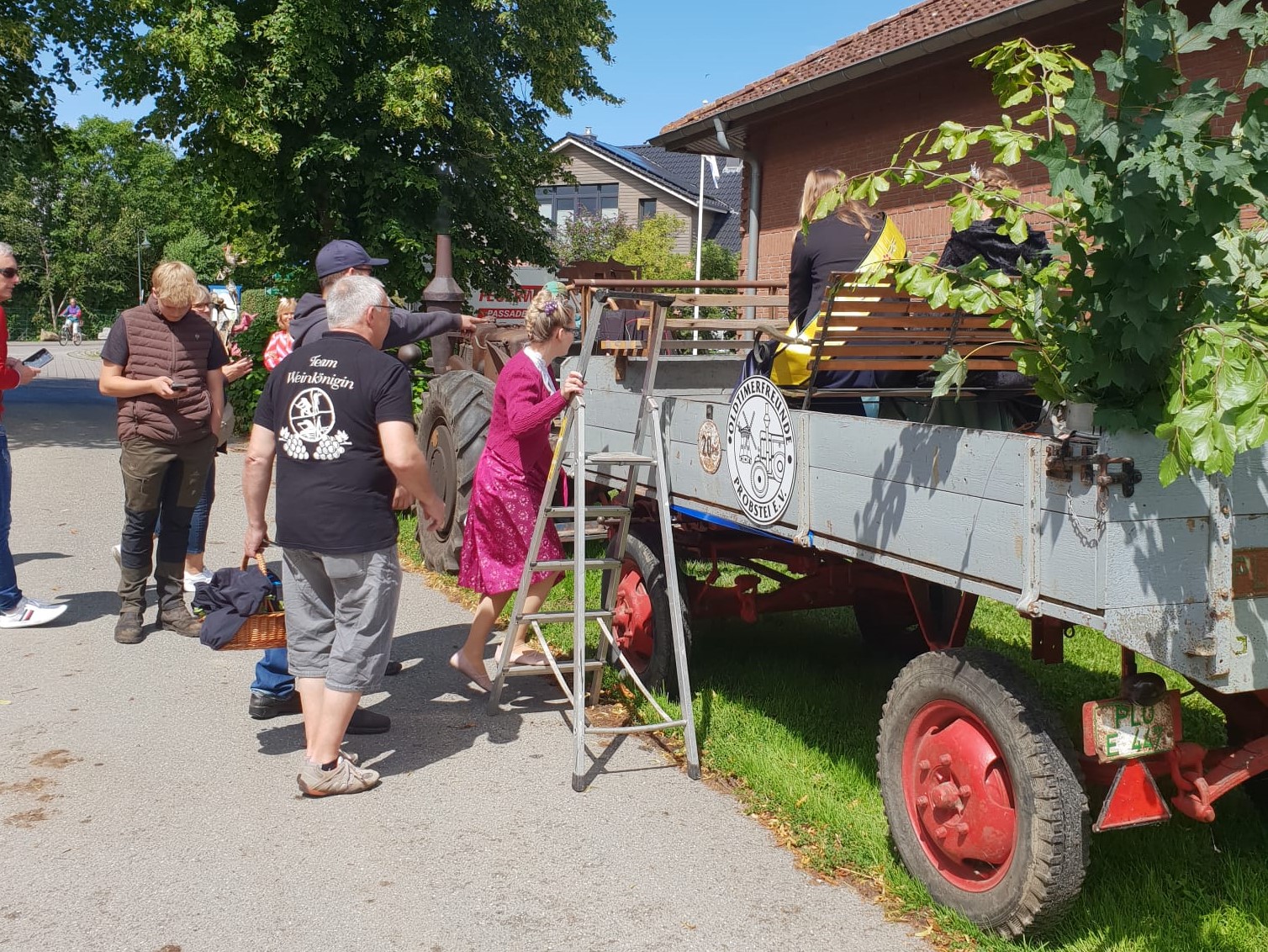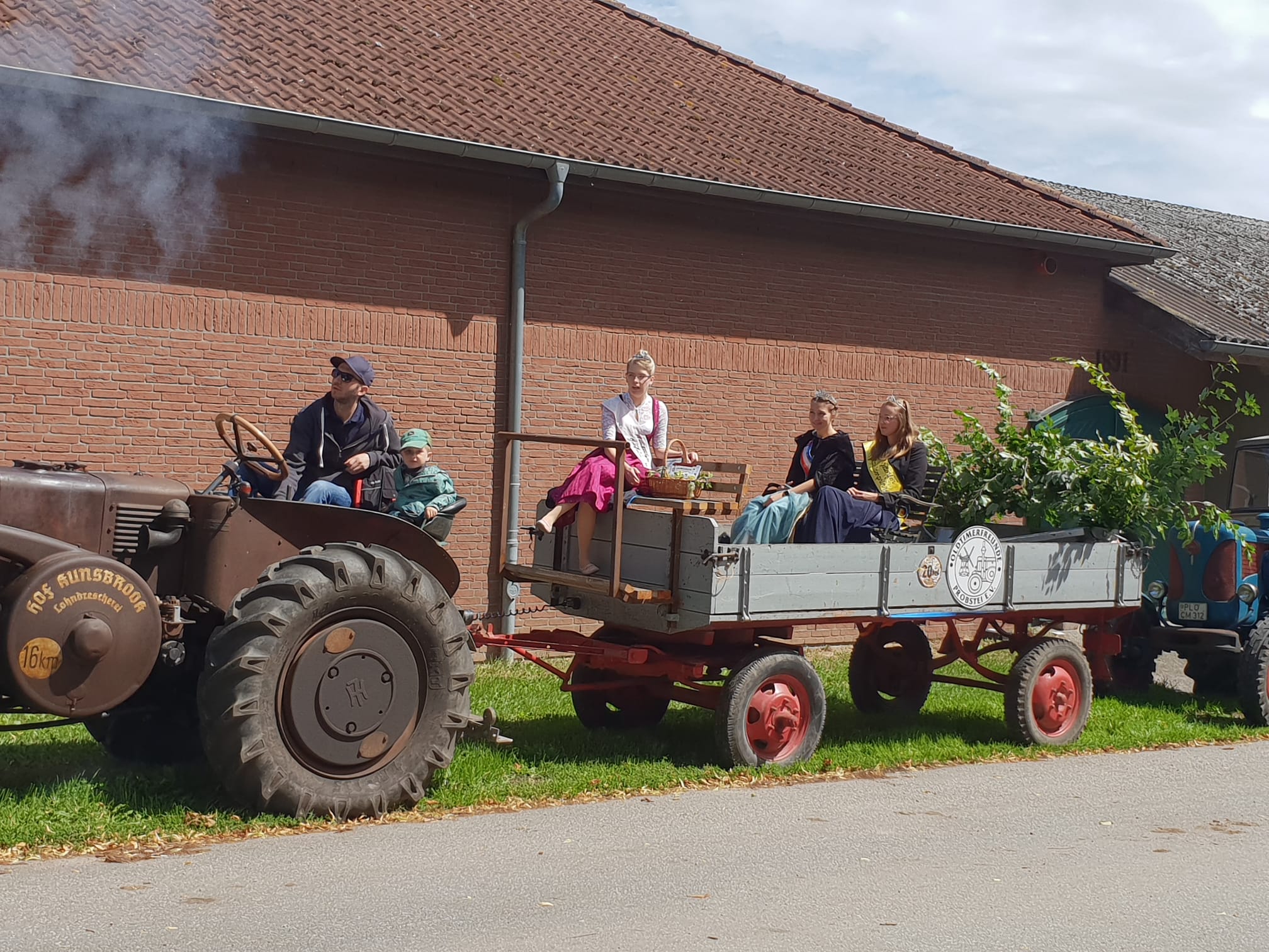Wir hatten die Aufgabe, die Majestäten (Kornkönigin, Prinzessin, Nachfolgerin und Gäste) mit unseren Gespannen zur Veranstaltung zu bringen. Dafür hatten sich zehn Trecker in Passade eingefunden. Für die Kornmajestäten und die Gäste (Weinkönigin Munster, Heideblütenkönigin Wittorf, Pellkartoffelhoheiten Hohenlockstedt, Rapsblütenkönigin Fehmarn,...) waren fünf geschmückte Kornhänger vorbereitet. Gemeinsam ging es dann also durch die Kornfelder über Fiefbergen zurück an den See nach Stoltenberg. Am See haben bereits zwei Boote auf die Majestäten gewartet.