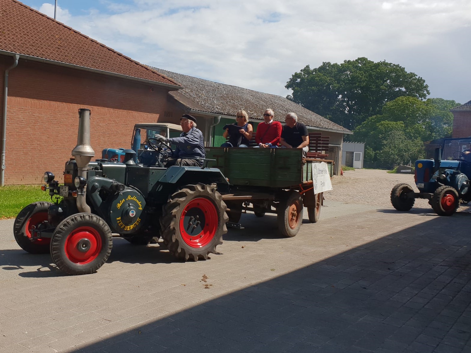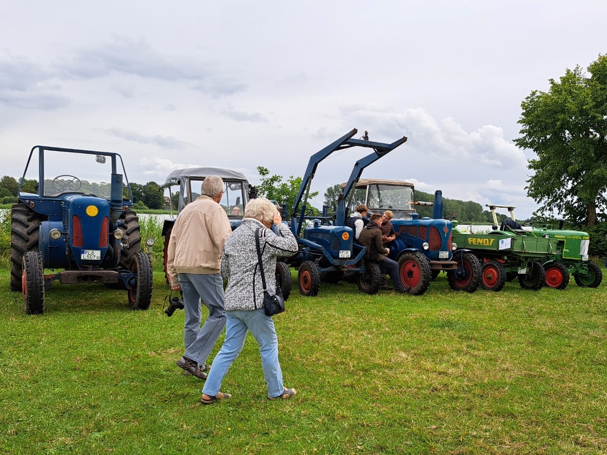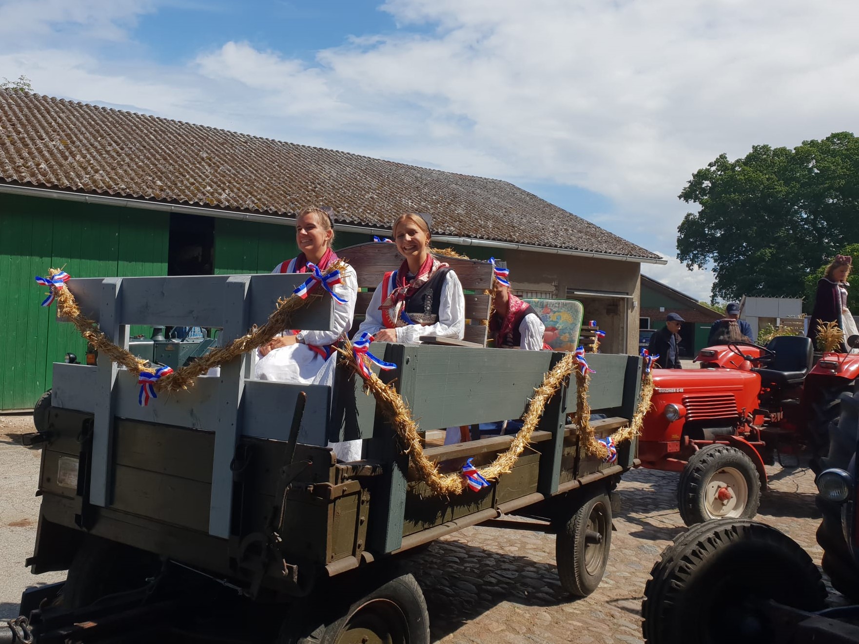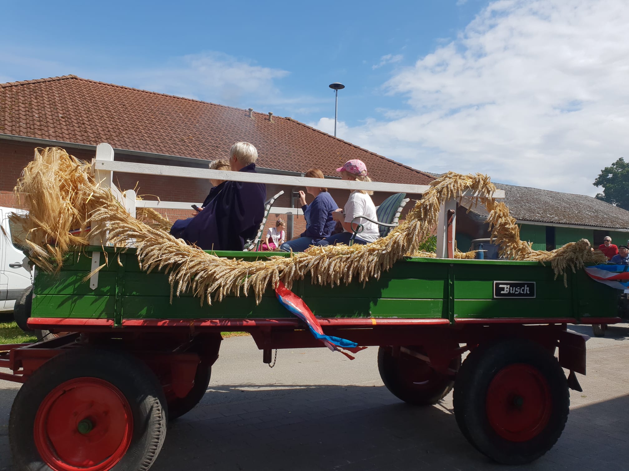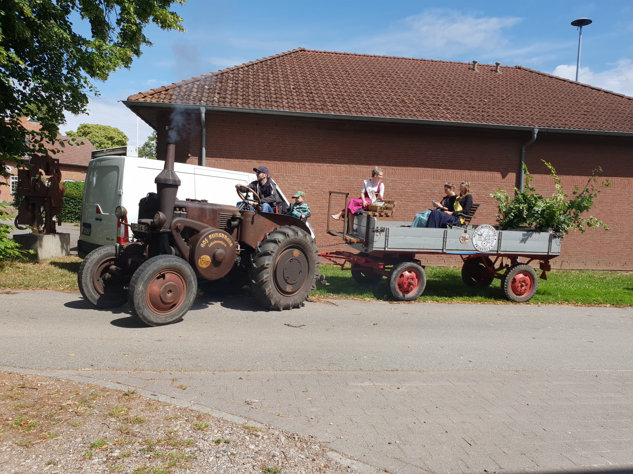 Wir hatten die Aufgabe, die Majestäten (Kornkönigin, Prinzessin, Nachfolgerin und Gäste) mit unseren Gespannen zur Veranstaltung zu bringen. Dafür hatten sich zehn Trecker in Passade eingefunden. Für die Kornmajestäten und die Gäste (Weinkönigin Munster, Heideblütenkönigin Wittorf, Pellkartoffelhoheiten Hohenlockstedt, Rapsblütenkönigin Fehmarn,...) waren fünf geschmückte Kornhänger vorbereitet. Gemeinsam ging es dann also durch die Kornfelder über Fiefbergen zurück an den See nach Stoltenberg. Am See haben bereits zwei Boote auf die Majestäten gewartet.
