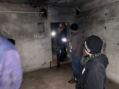 Die Straße hoch kommt man an einen grauen Munitionsbunker. Anders als viele Bunker um Kiel herum wurde er nicht geprengt, heute leben darin Fledermäuse. Von ihm führt eine Allee zum eigentlichen Geschütz. Auf dem linken Hügel sind die Überreste der "Leitst. II". Hier lassen sich auch noch die Bolzen erkennen, mit denen ein Geschütz befestigt wurde. Auf der rechten Seite befindet sich ein Bunker, in dem die Zielberechnungen gemacht wurden und teilweise die Mannschaften gelebt haben. Hier haben uns den Schlüssel zum Bunker organisiert. In zwei Räumen ist das Wasserwerk eingezogen, der Rest ist wie früher und in einem guten, trockenen Zustand. Er lässt die Enge erahnen, in der damals dort gelebt und gearbeitet wurde.