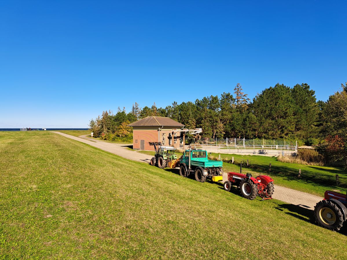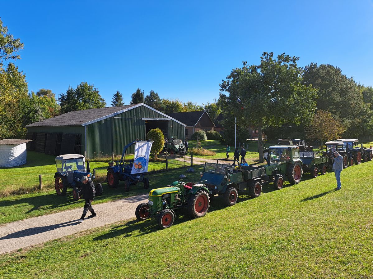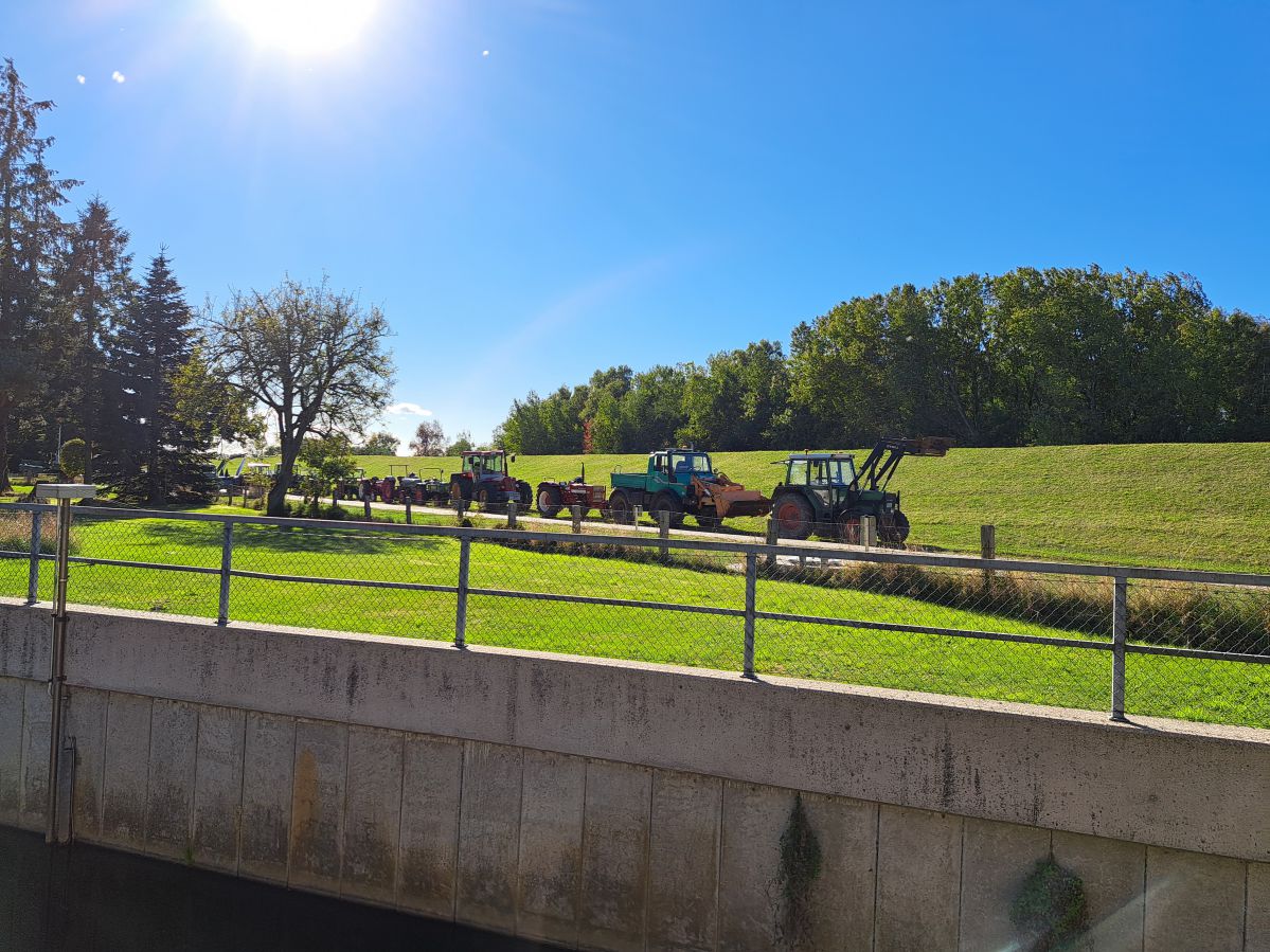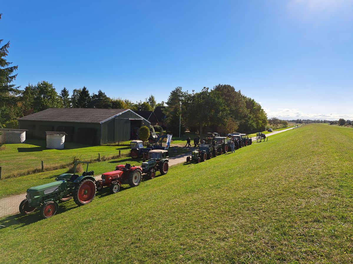 Am Tag der Deutschen Einheit, den 3. Oktober 2024, trafen wir uns um 13:00 Uhr am Irrgarten in Probsteierhagen zu unserer Herbstausfahrt. Es waren 23 Fahrzeuge eingetroffen, überwiegend natürlich Traktoren, aber einige Unimogs waren auch dabei. Ziel war die Schleuse in Wendtorf. Der Konvoi setzte sich mit Jochen auf seinem kleinen Ritscher an der Spitze in Richtung Passade in Bewegung, kurz vor Passade wurde links auf eine Bauernautobahn abgebogen (Henning sperrte die Gegenfahrbahn der Kreisstraße fachgerecht mit seinem Fendt ab), dann ging es über Prasdorf und Barsbek weiter nach Wendtorf. In einem engen Feldweg wurde dann getestet, ob bei allen Fahrzeugen der Rückwärtsgang funktioniert und danach kamen wir gegen 14:00 in Wendtorf hinter dem Deich an der Schleuse an. Hier erwartete uns schon Herr Fink vom Deich-und Entwässerungsverband Probstei, um uns über die Funktion der Schleuse mit Einlauf-und Auslaufbauwerken zu informieren. Zum Verbandsgebiet gehören ca. 2000 ha Landfläche. Das Oberflächenwasser des größten Teils der Verbandsfläche wird über die Fernau und dann durch die Schleuse in die Ostsee entwässert. Die Schleuse ist erforderlich, weil das Land hinter dem Deich ca. 70cm tiefer liegt als die Ostsee. Die Überwindung des Höhenunterschiedes wird durch zwei mächtige Pumpen im Schleusenhaus ermöglicht. Der Pumpensumpf ist ca. 5,00m tiefer als der Wasserspiegel im Einlauf und die 2 Pumpen haben eine Förderleistung von ca. 3600m3/h und ca. 1400m3/h. Faszinierend zu sehen, dass die über40 Jahre alten Pumpen, bedingt durch gute Pflege und Wartung, zuverlässig ihren Dienst tun. Danach gab es in der Bauhofhalle des Deichverbandes eine Wurst vom Grill, perfekt zubereitet von Mirco und Christian. Nachdem geklönt und der Durst gelöscht war, machten wir uns gegen 16:00 durch Wendtorf, vorbei an der Strohfigur, mit der Sonne im Rücken auf den Weg nach Haus.
