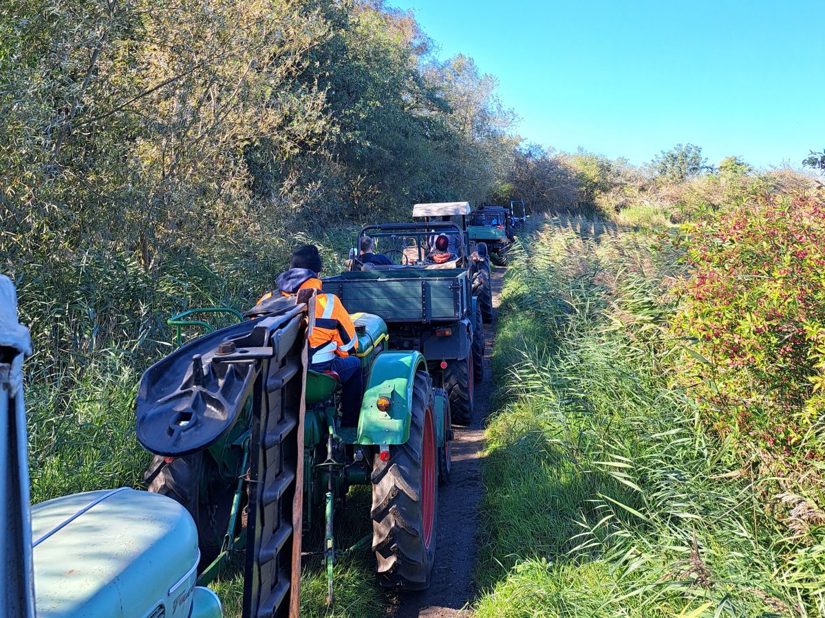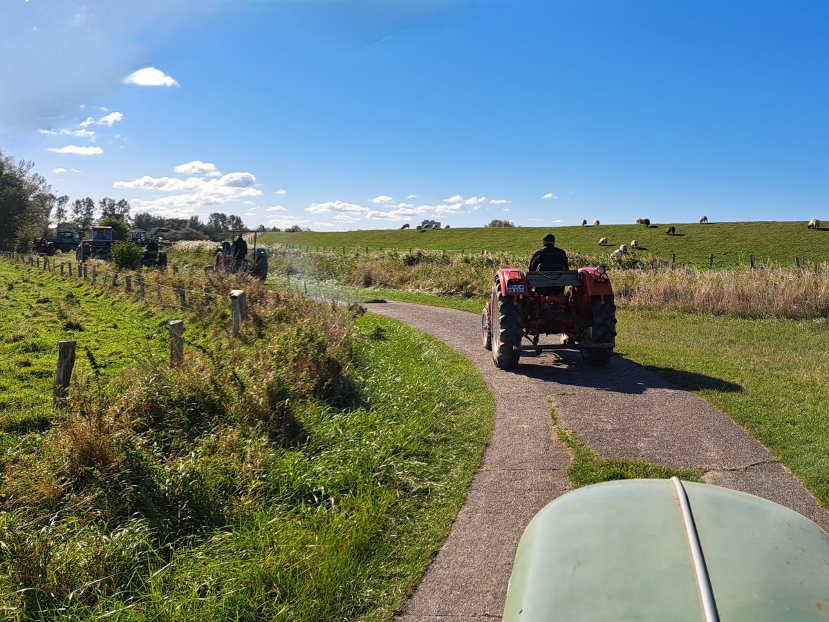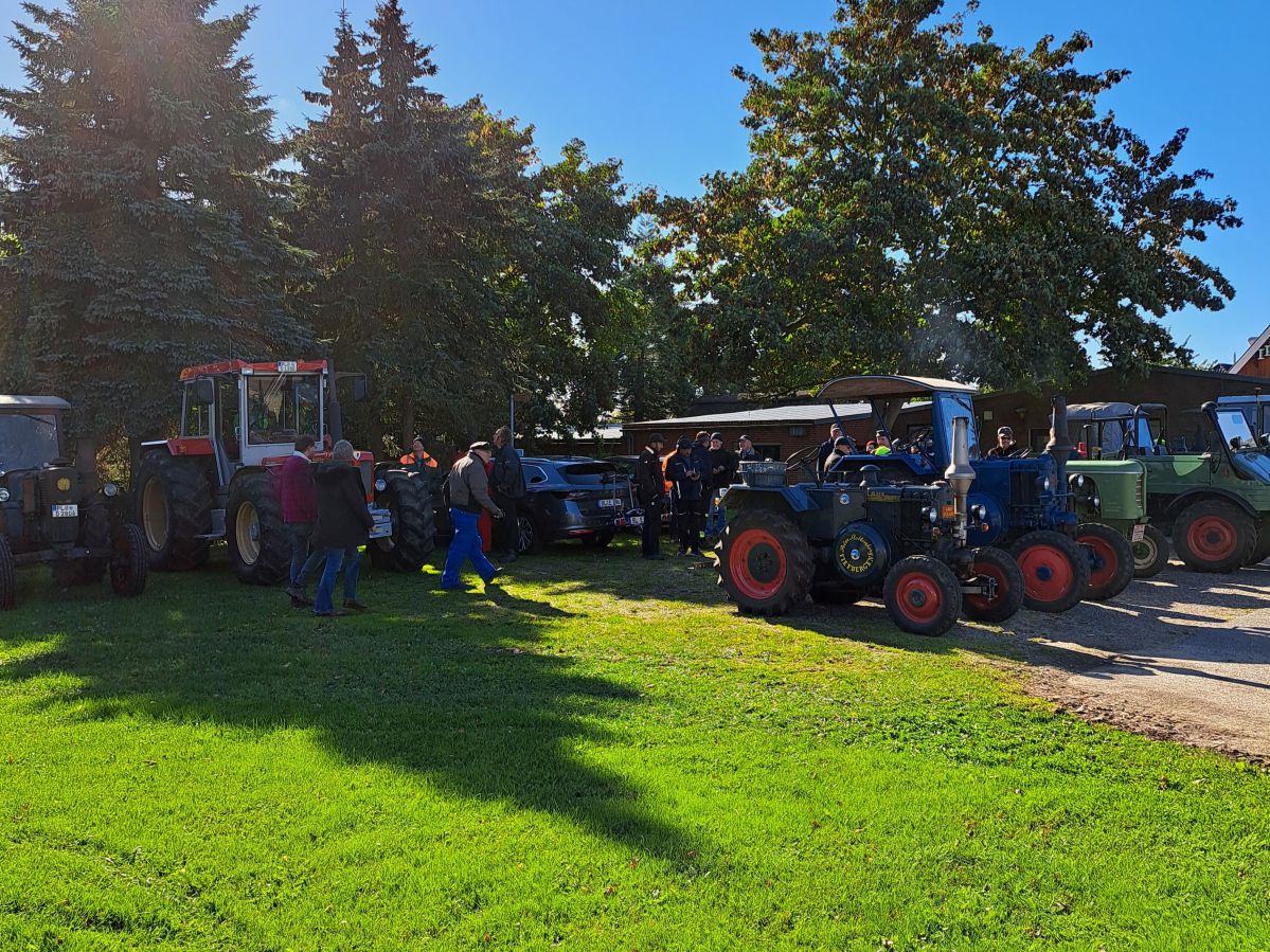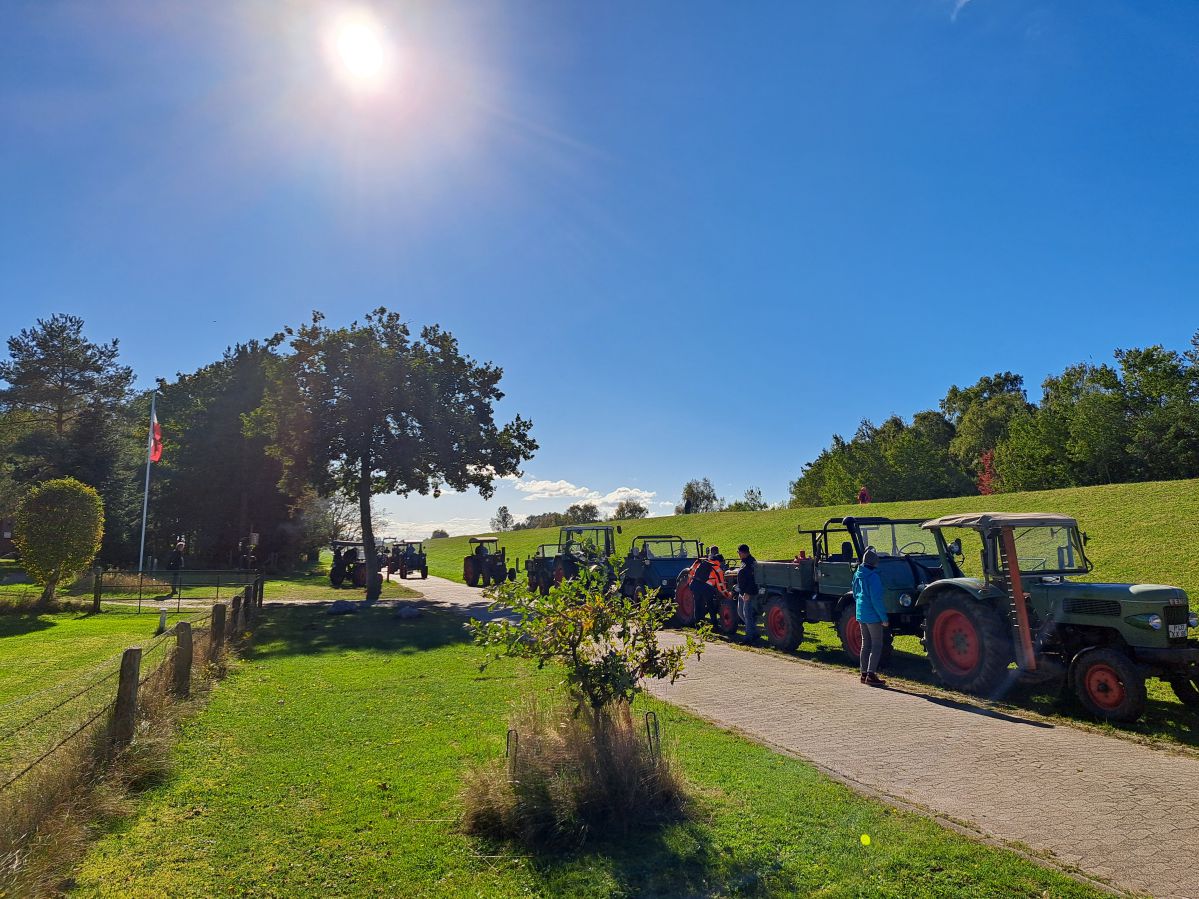 Am Tag der Deutschen Einheit, den 3. Oktober 2024, trafen wir uns um 13:00 Uhr am Irrgarten in Probsteierhagen zu unserer Herbstausfahrt. Es waren 23 Fahrzeuge eingetroffen, überwiegend natürlich Traktoren, aber einige Unimogs waren auch dabei. Ziel war die Schleuse in Wendtorf. Der Konvoi setzte sich mit Jochen auf seinem kleinen Ritscher an der Spitze in Richtung Passade in Bewegung, kurz vor Passade wurde links auf eine Bauernautobahn abgebogen (Henning sperrte die Gegenfahrbahn der Kreisstraße fachgerecht mit seinem Fendt ab), dann ging es über Prasdorf und Barsbek weiter nach Wendtorf. In einem engen Feldweg wurde dann getestet, ob bei allen Fahrzeugen der Rückwärtsgang funktioniert und danach kamen wir gegen 14:00 in Wendtorf hinter dem Deich an der Schleuse an. Hier erwartete uns schon Herr Fink vom Deich-und Entwässerungsverband Probstei, um uns über die Funktion der Schleuse mit Einlauf-und Auslaufbauwerken zu informieren. Zum Verbandsgebiet gehören ca. 2000 ha Landfläche. Das Oberflächenwasser des größten Teils der Verbandsfläche wird über die Fernau und dann durch die Schleuse in die Ostsee entwässert. Die Schleuse ist erforderlich, weil das Land hinter dem Deich ca. 70cm tiefer liegt als die Ostsee. Die Überwindung des Höhenunterschiedes wird durch zwei mächtige Pumpen im Schleusenhaus ermöglicht. Der Pumpensumpf ist ca. 5,00m tiefer als der Wasserspiegel im Einlauf und die 2 Pumpen haben eine Förderleistung von ca. 3600m3/h und ca. 1400m3/h. Faszinierend zu sehen, dass die über40 Jahre alten Pumpen, bedingt durch gute Pflege und Wartung, zuverlässig ihren Dienst tun. Danach gab es in der Bauhofhalle des Deichverbandes eine Wurst vom Grill, perfekt zubereitet von Mirco und Christian. Nachdem geklönt und der Durst gelöscht war, machten wir uns gegen 16:00 durch Wendtorf, vorbei an der Strohfigur, mit der Sonne im Rücken auf den Weg nach Haus.