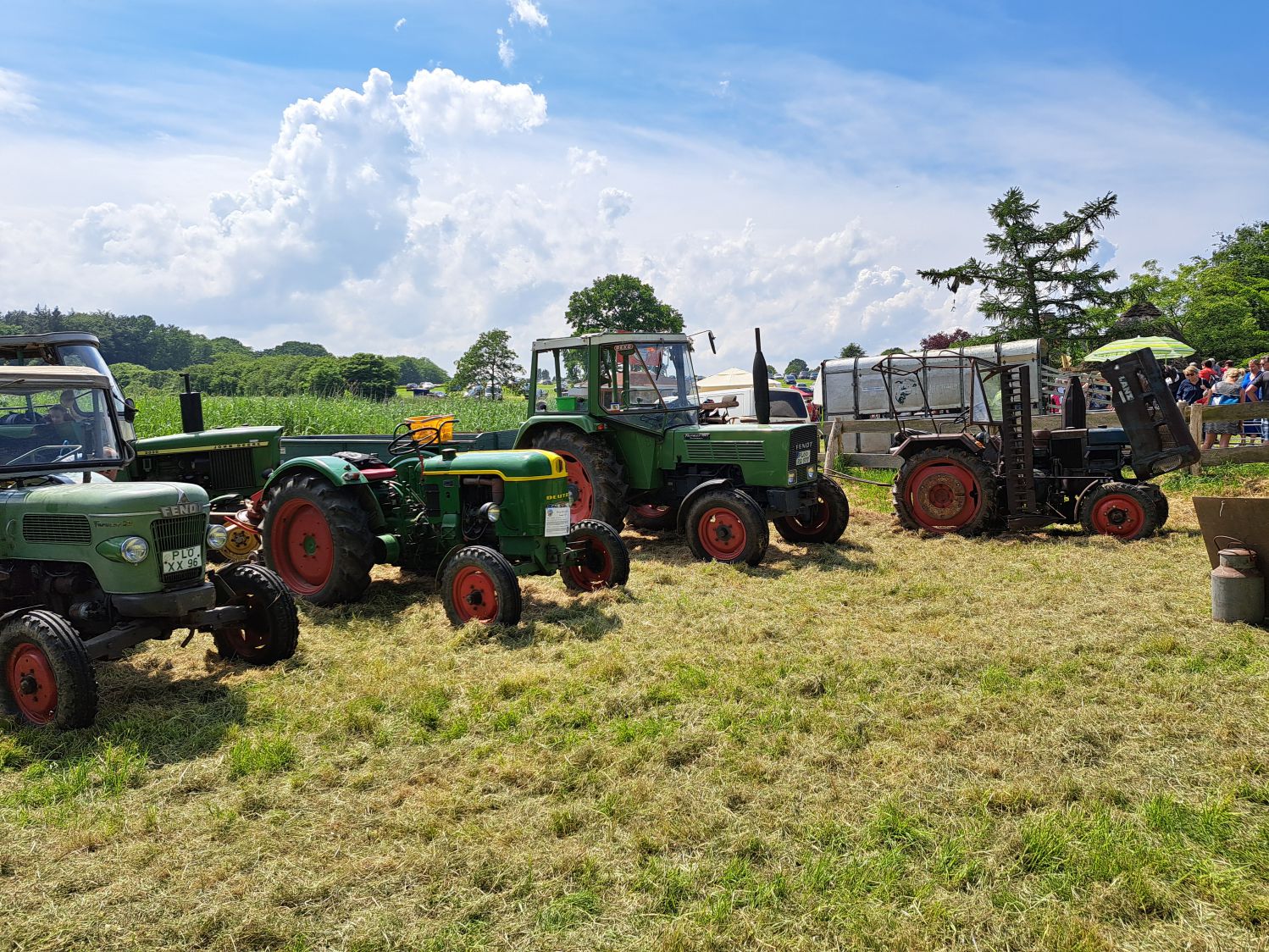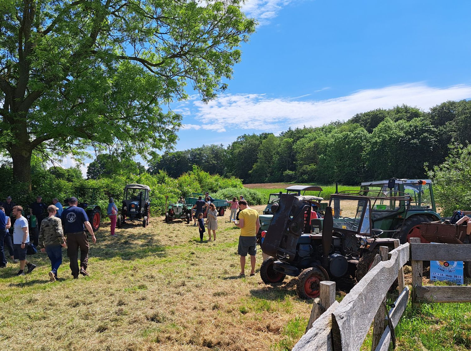 Der Hof Steffen mit seiner Schlachterei und Räucherei veranstaltet alle paar Jahre einen Hoftag. Es gab neben der hauseigenen Grillwurst, Burger, Kuchen, Getränken usw. auch Erzeugnisse von anderen Höfen (z.B. Moorhörn Passade, Stoltenberg-Frick Stakendorf, ...), Honig, Räucherfisch, Pflanzen und Blumen, Kunsthandwerk, Kleintiere uvm. Und wir waren auch eingeladen uns auf eine Wiese direkt an den Kasseteich zu stellen. Ein dutzend Trecker sind gekommen, teilweise mit Anhängern und Heuwender.