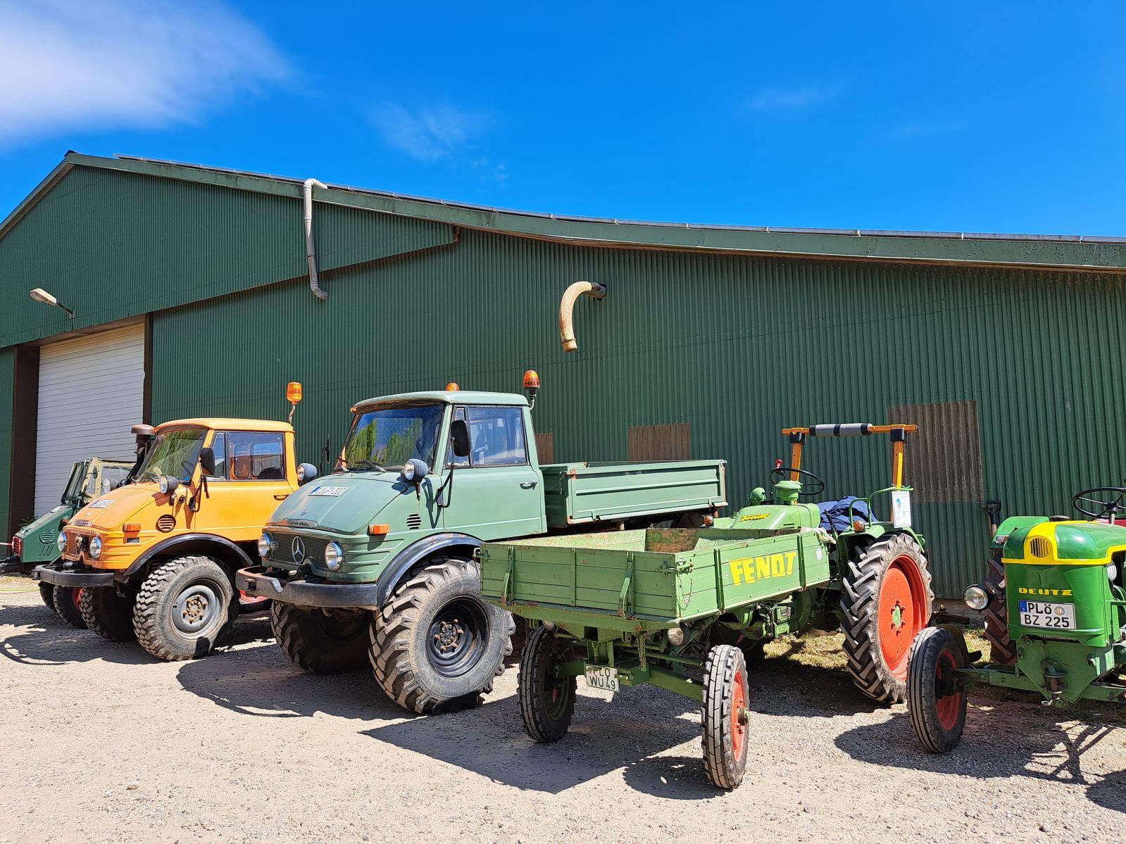 Nur wenige Busminuten weiter in Glüsing befindet sich der Hof von Niko Rohde. Niko ist eine Freund des Vereins. Letztes Jahr hat er in Krokau den Lanz Knicklenker und zuvor die Lanz-Raupe und den HR2 vorgestellt. Und in der Vergangenheit waren wir auch immer mal auf seinem eigenen, sehr schönen Hoftreffen dabei. Die Sammlung umfasst viele Lanz-Bulldogs aber auch Motorräder und alte Autos. Aber auch Kuriositäten wie dem amerikanischen Feuerwehrauto, der Cessna am Gartenteich und der „Rote Faxe“ – einen umgebauten LKW.