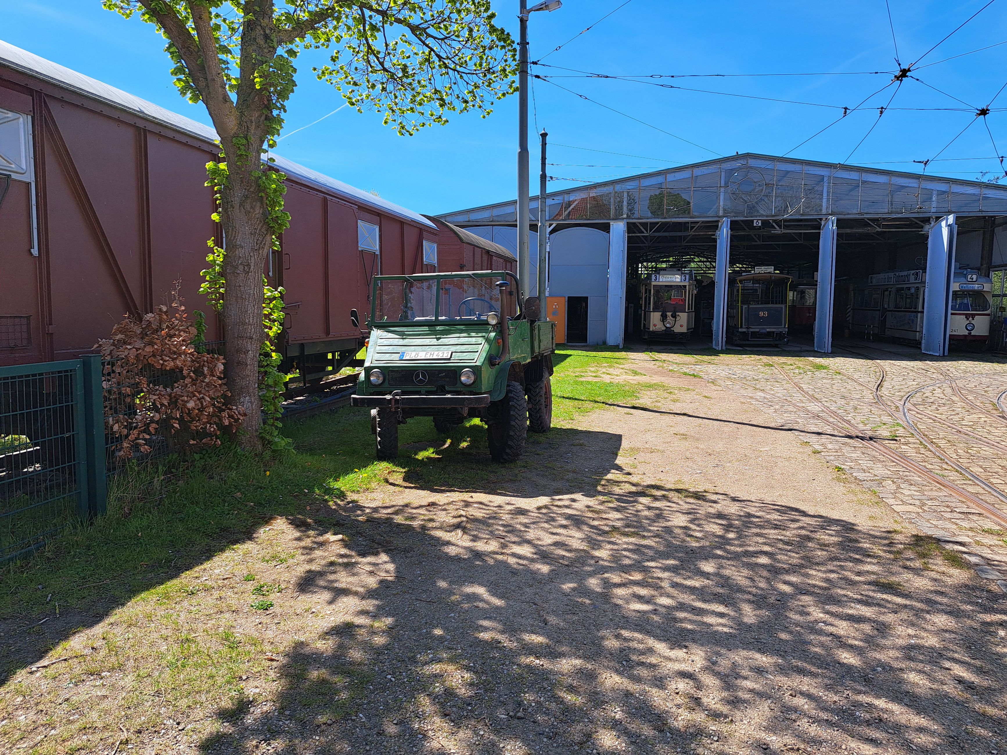 Auf dem Gelände hat der Verein ein Netz aus Schienen für Straßenbahnen verlegt. Hier fahren unter anderem viele ehemalige Straßenbahnen aus Kiel. Ein schöner Anblick, wie diese den gesamten Besuch über um den Hof herum rattern.