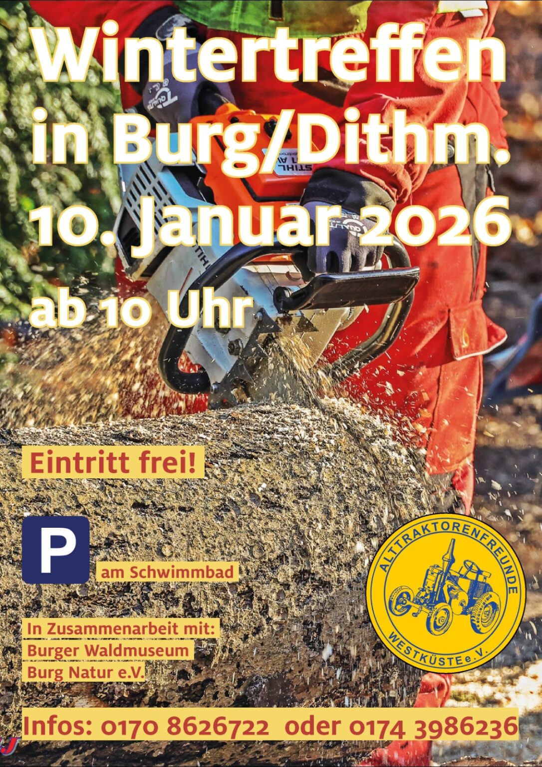 Nach Jahr Nach Monat Nach Woche Heute Suche Gehe zu Monat Januar Februar März April Mai Juni Juli August September Oktober November Dezember 2024 2025 2026 2027 2028 Gehe zu Monat Event exportieren iCal-Datei speichern An Google Kalender senden An Yahoo Kalender senden Send to Outlook Live Send to Microsoft Outlook iCal-Datei speichern Beschreibungsformatierung beibehalten (nur in einigen Kalender Anwendungen unterstützt) Besuch: Wintertreffen Burg/Dithm. Am Samstag, 10. Januar 2026, Beginn 10:00 Infos unter: https://www.alttraktorenfreunde.de/ Treffpunkt: Am Schwimmbad / Burg/Dithm.